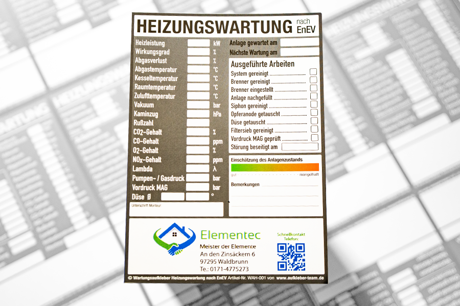 Personalisierte Wartungsaufkleber mit Ihren Kontaktdaten und Log dokumentieren den Wartungsdienst und sorgen für Kundenbindung. Unsere Wartungsaufkleber für Heizungen werden speziell für Heizungsfirmen, Wartungsdienste und Heizung-Sanitär-Installateure entwickelt.