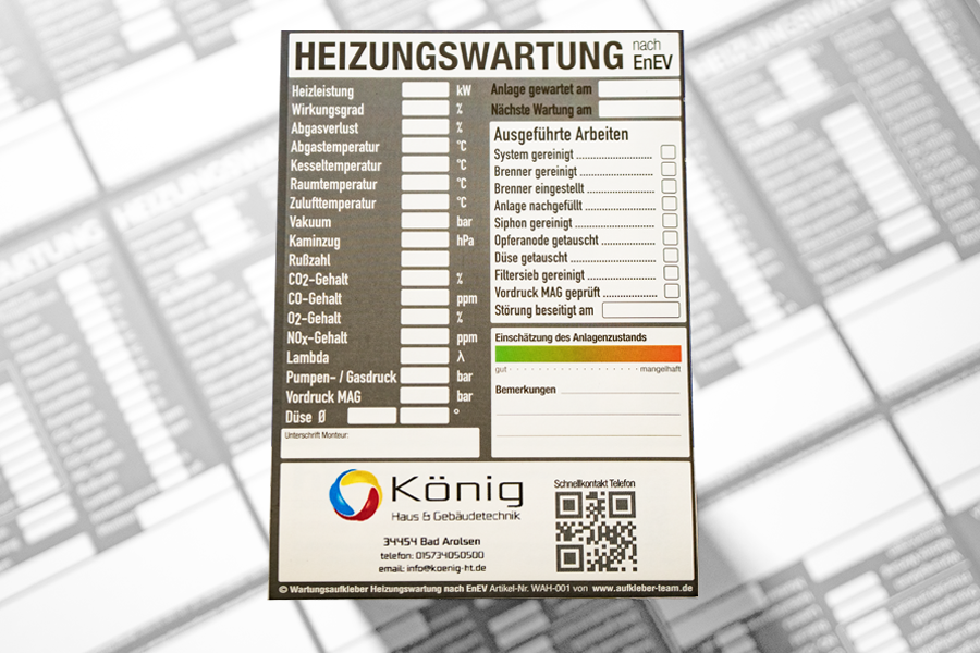 Willkommen beim AUFKLEBER-Team in Lübeck – der Manufaktur für hochwertige und innovative Wartungsaufkleber für Heizungen. Bei uns finden Sie Wartungsaufkleber in vielen Varianten – von universellen Wartungsaufklebern für Öl- und Gasheizungen sowie Wärmepumpen bis zu individuellen Wartungsaufklebern nach Kundenwunsch. Ab eine Auflage von 1000 Stück entwerfen und drucken wir Ihren Wunschaufkleber ohne Zusatzkosten.