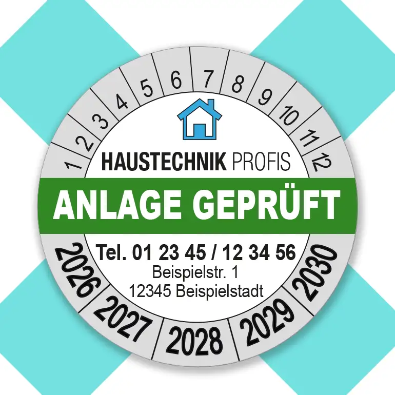 Die Prüfplaketten „Anlage geprüft“ dokumentieren die Prüfung von Anlagen. Diese Prüfetiketten kleben auf allen Geräten, die regelmäßig geprüftwerden (müssen). Als Fachbetrieb für Prüfungen zeigen Sie damit, wann die Prüfung durchgeführt wurde. Die Prüfplaketten „Anlage geprüft“ beinhalten auch Ihre Firmendaten zur schnellen Kontaktaufnahme. Im oberen Teil der Prüfplaketten wird von unserem Grafik-Team Ihr Firmenlogo integriert. Auf diese Weise funktionieren die Prüfplaketten wie ein Firmenaufkleber und zeigen dem Kunden, wer für die Wartung und den Service der Anlage oder des Geräts zuständig ist.